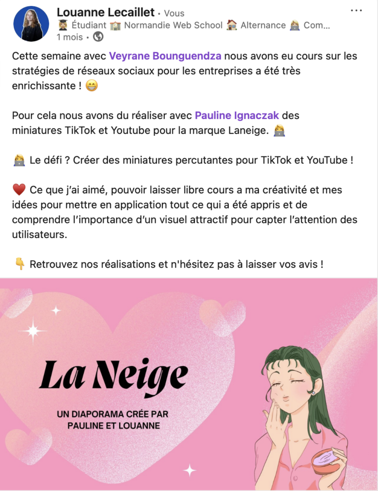 Dans le cadre de cet atelier, nous avons travaillé en binôme avec pour concevoir des miniatures TikTok et YouTube destinées à la marque Laneige, connue pour ses produits de beauté. Le défi ? Créer des visuels percutants capables d’attirer l’attention des utilisateurs en quelques secondes !